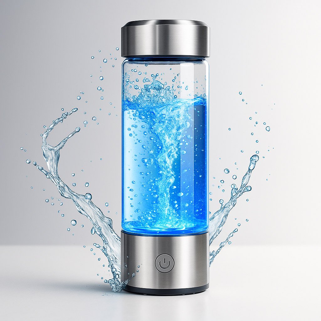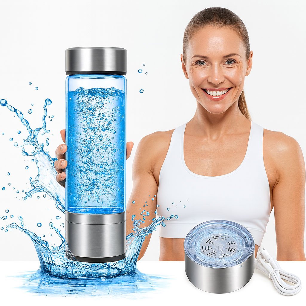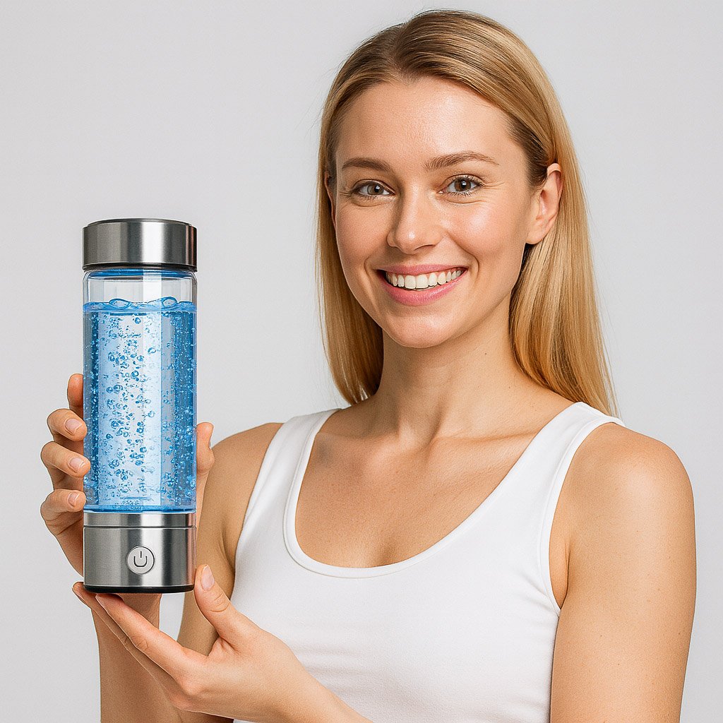 The HydroClear bottle uses electrolysis and catalyst technology to infuse molecular hydrogen into drinking water. It also filters and structures water, helping with hydration, antioxidant benefits, and cellular wellness.